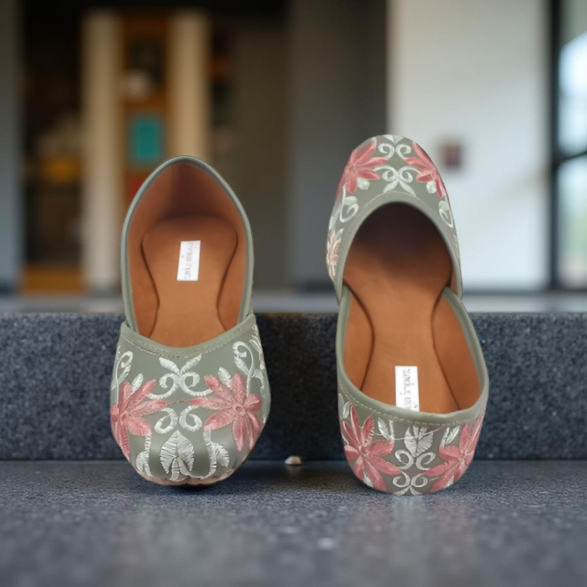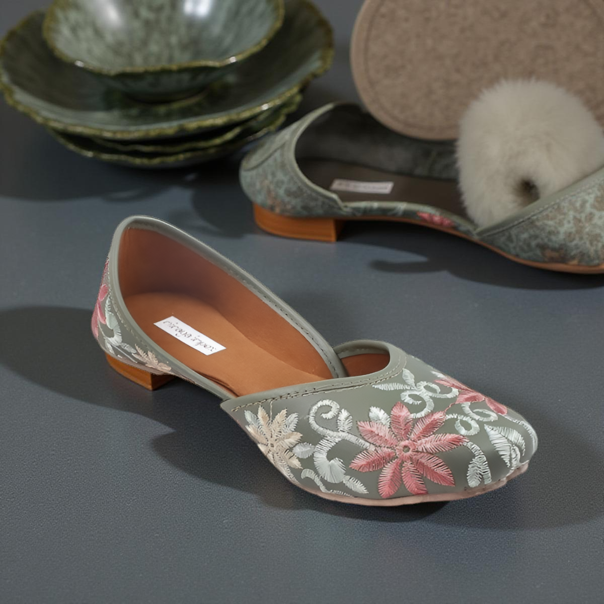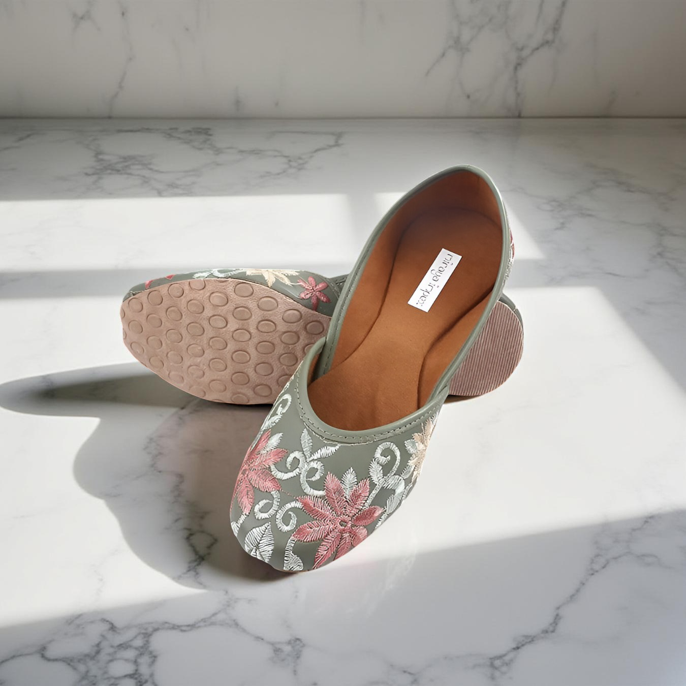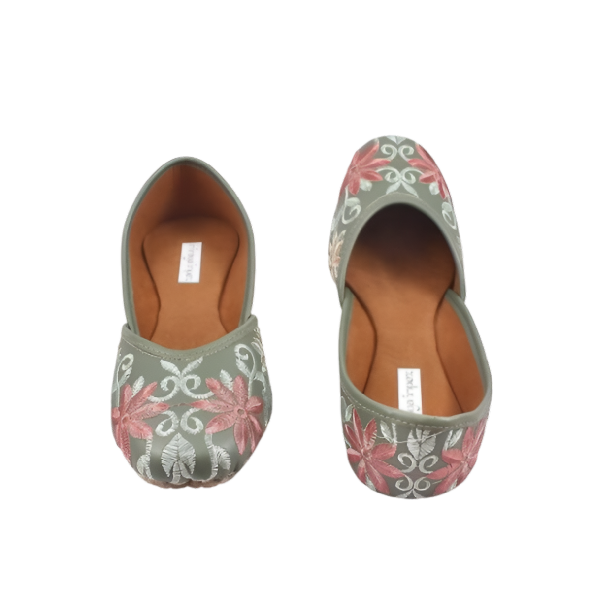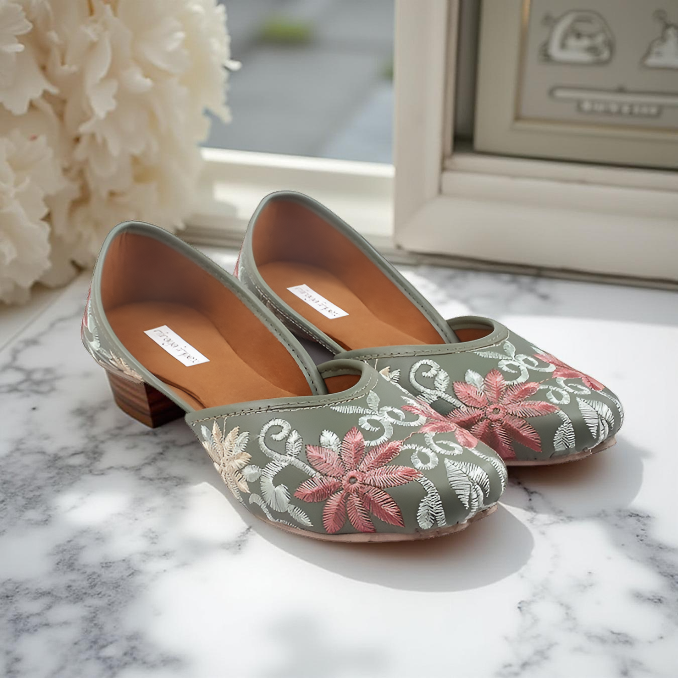 A beautifully handcrafted olive green jutti featuring intricate floral embroidery, perfect for adding a touch of elegance to your ethnic wardrobe. Pair these with sarees, suits, or even indo-western outfits to elevate your look effortlessly.