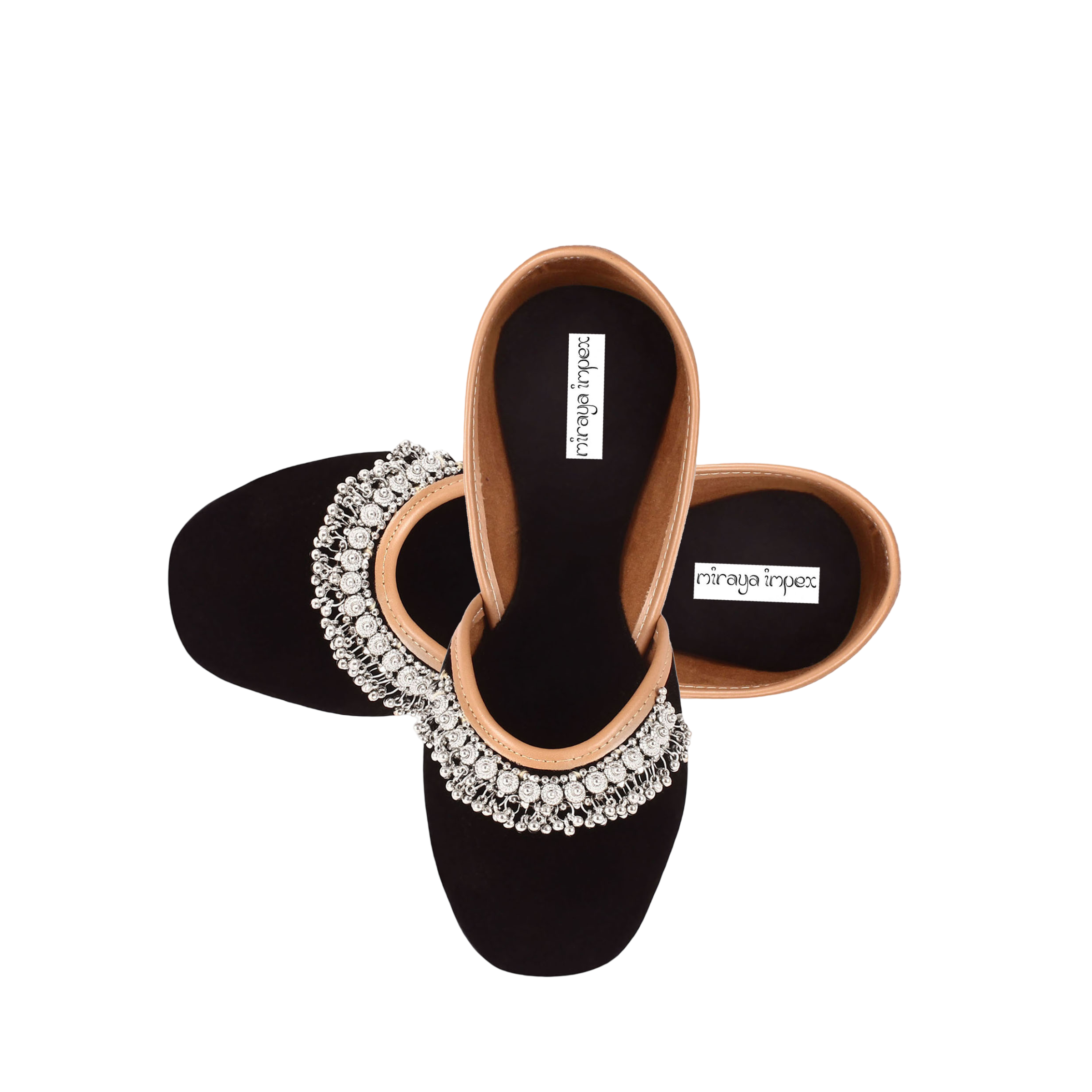 Black Payal Jutti, a perfect blend of sophistication and cultural allure. Designed for those who appreciate timeless beauty, this handcrafted jutti features delicate embellishments on a classic black base, exuding a regal charm.